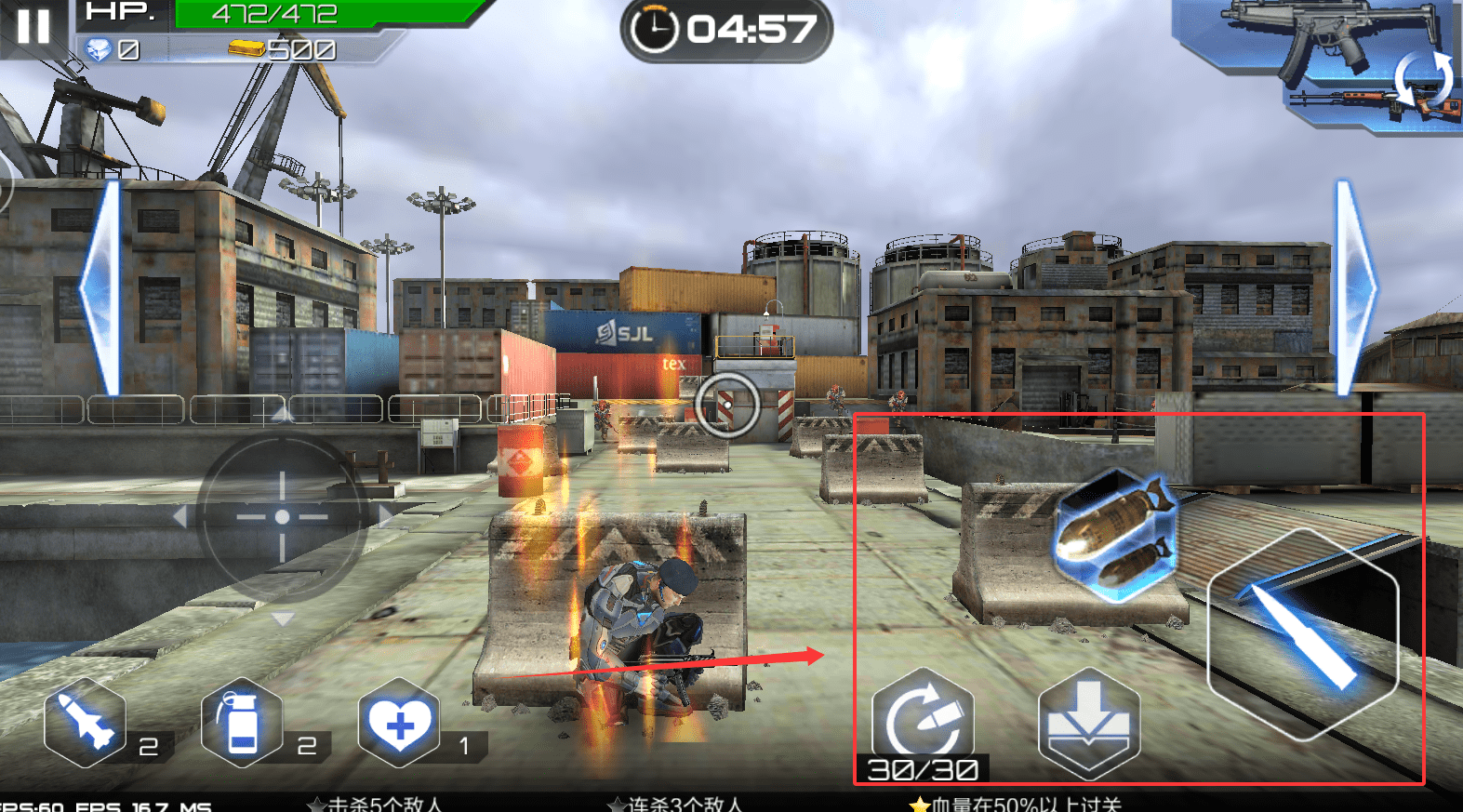 游戏采用了滑屏控制和攻击按钮结合的方式,玩家们手指滑动屏幕左边可以控制瞄准,点击屏幕右下角的攻击按钮即可开枪射击。游戏中我们的主角无法自由移动,只能躲在防御工事后面,攻击的时候则会自动起身,不过好在玩家们可以点击屏幕左右两边的箭头来控制角色左右移动,更换防御设施,这样在战斗中也能更好的掌控战场攻击有利位置。本作的操作虽然少了自由走动的控制,但是这也让玩家们能更加精准的瞄准和射击。