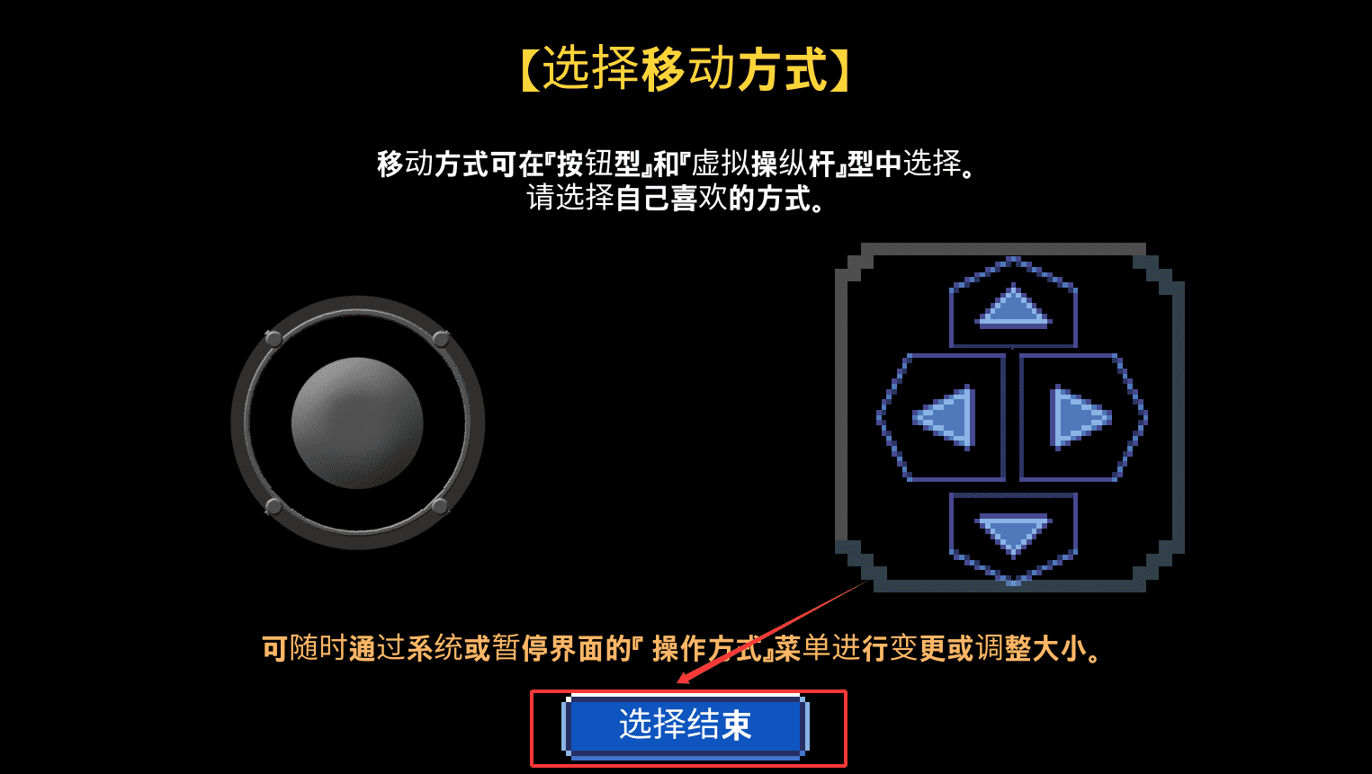 2、游戏刚开始时,系统很贴心地会让你选择移动方式,一种是“按钮型”,一种是“虚拟操纵杆”型。