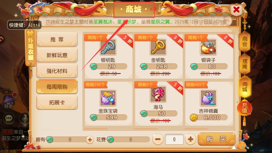 1、商城购物指南:通过“商城”入口,你可以购买各种道具。左侧导航栏有“推荐”、“每周限购”等分类,右侧是商品列表,商品会明确标出折扣(如5折)和限购数量。