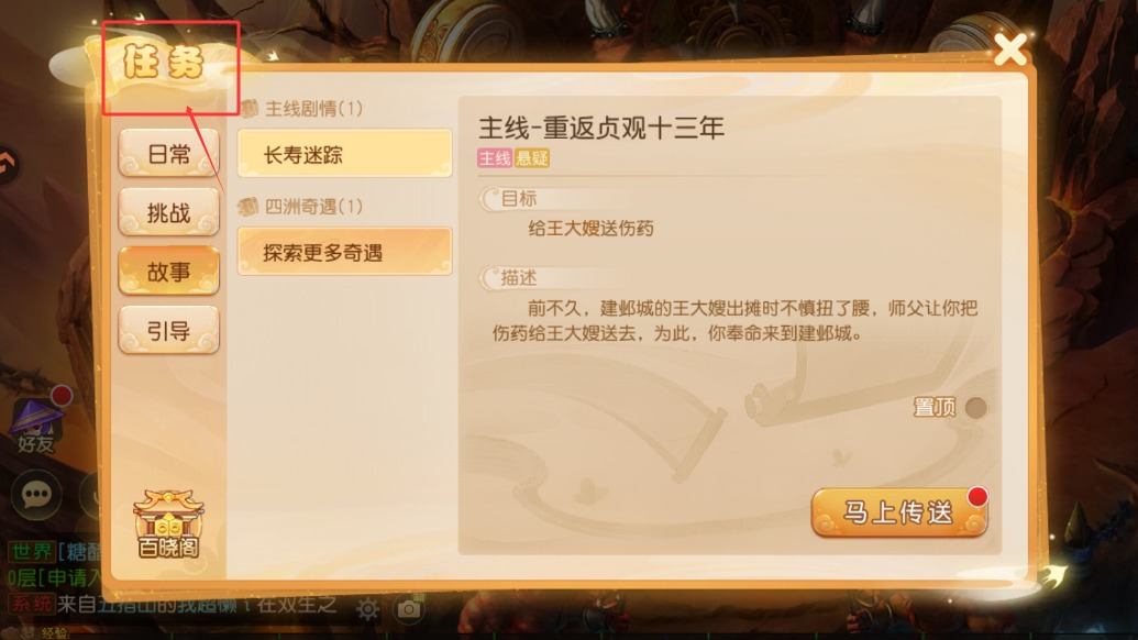 3、任务完成指南:游戏的核心驱动力是任务。当前任务会显示在屏幕右上方,例如“重返贞观十三年 - 给王大嫂送伤药”。
