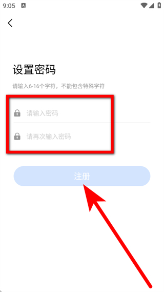5、在设置密码页面,设置密码,点击注册,完成账号注册。