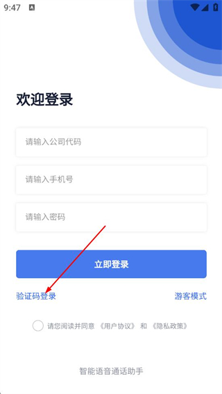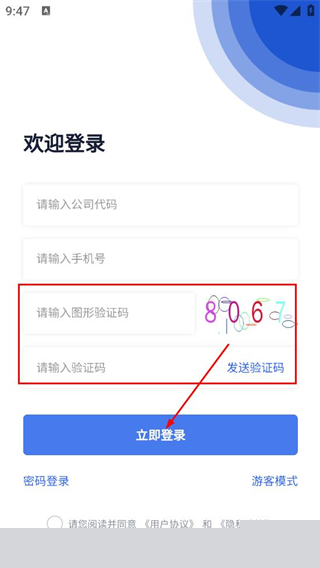 2、在验证码登录界面,填写请输入公司代码和请输入手机号对应的内容。