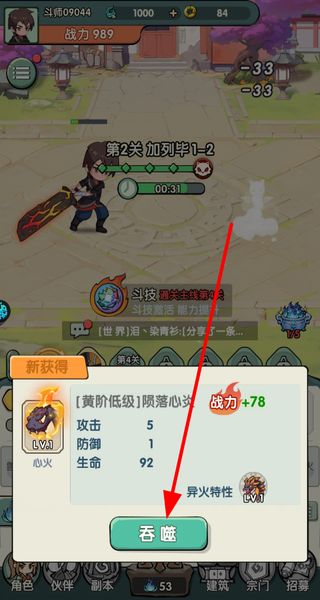 3、获得新的异火后点击吞噬,将其融入自身,异火会提供攻击防御等属性加成,同时提升自身的战力数值。