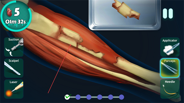 1、用镊子将托盘里的骨片对应到手臂骨折处,完成骨骼复位步骤。