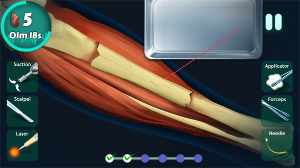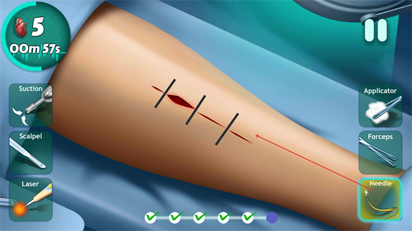 提供 scalpel、止血钳、缝合针等全套专业医疗器械,不同手术环节需选用对应工具,工具操作手感贴合真实,让你体验专业外科医生的操作规范。