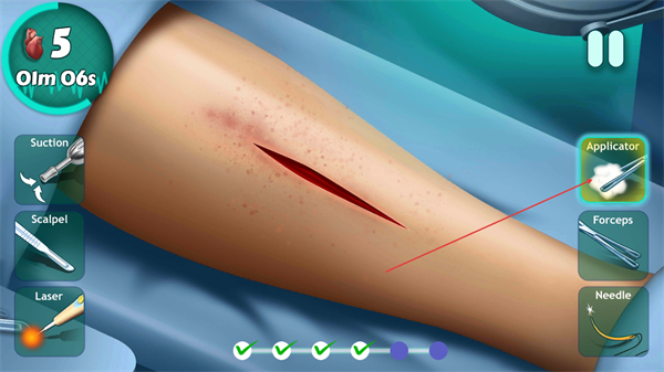 3、选择右侧Applicator,对伤口区域进行处理,推进手术流程。