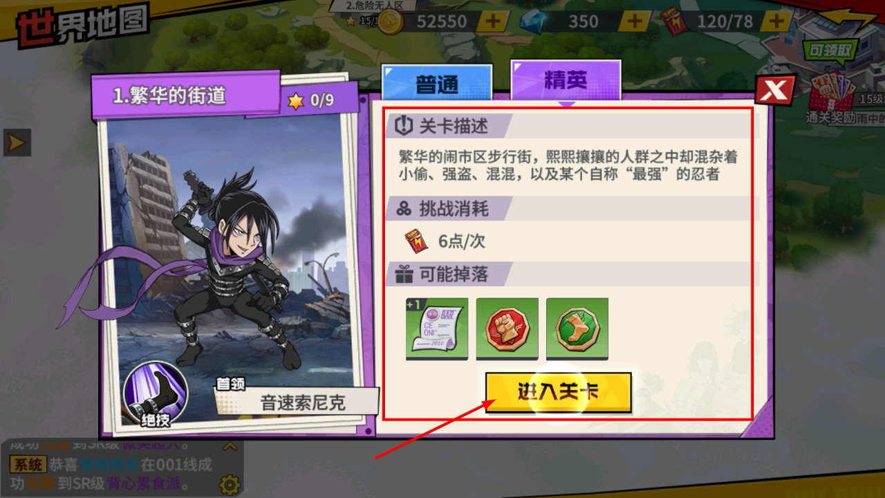 2、选择精英关卡后,查看关卡描述与消耗,确认【6点/次】的挑战消耗,点击进入关卡开始挑战目标敌人。