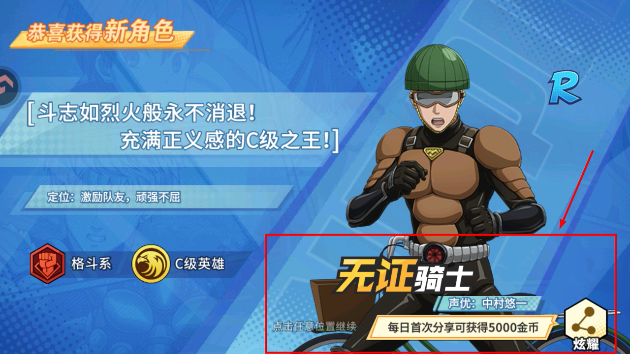 1、获得新角色【无证骑士】后点击任意位置继续,该角色定位激励队友且顽强不屈,可准备安排其加入队伍提升战力。