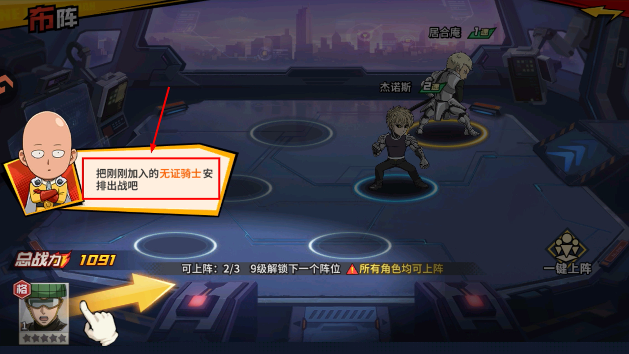 2、在布阵界面将刚加入的【无证骑士】安排到出战位置,合理配置阵容能提升队伍总战力,为后续战斗做好准备。