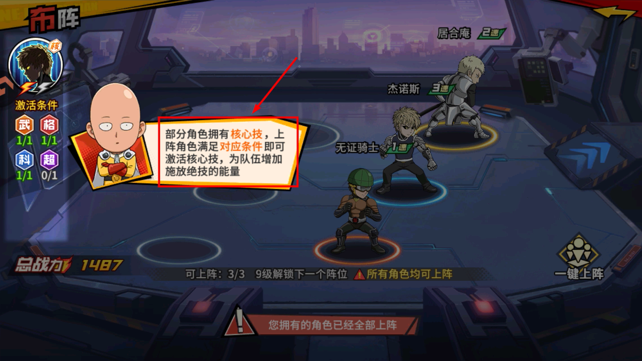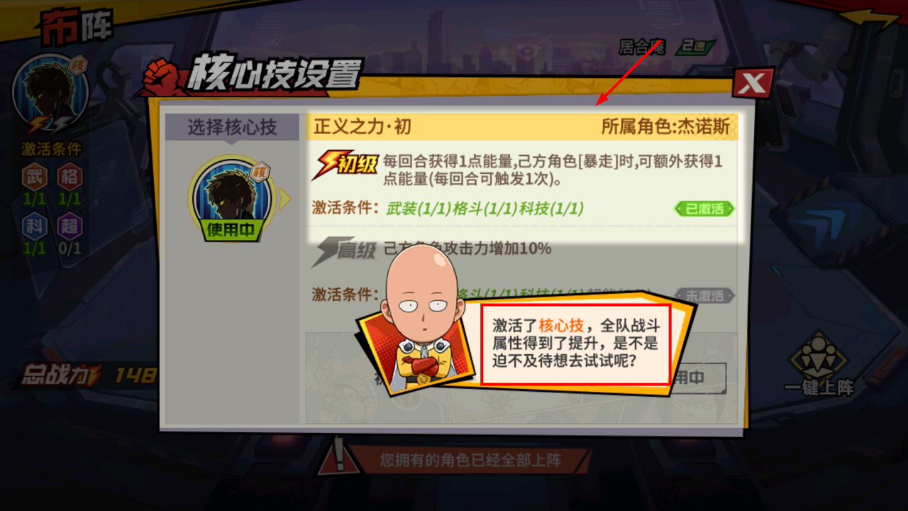 4、激活【核心技】后全队战斗属性会提升,可通过核心技设置界面确认效果,之后就能进入战斗测试战力。