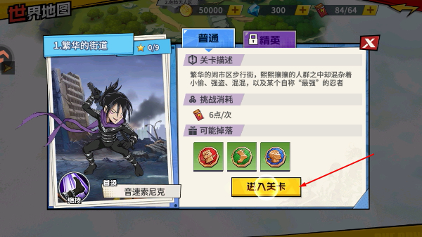 4、进入【繁华的街道】关卡前,确认每次挑战消耗6点,了解敌人类型后点击按钮开始挑战获取奖励。