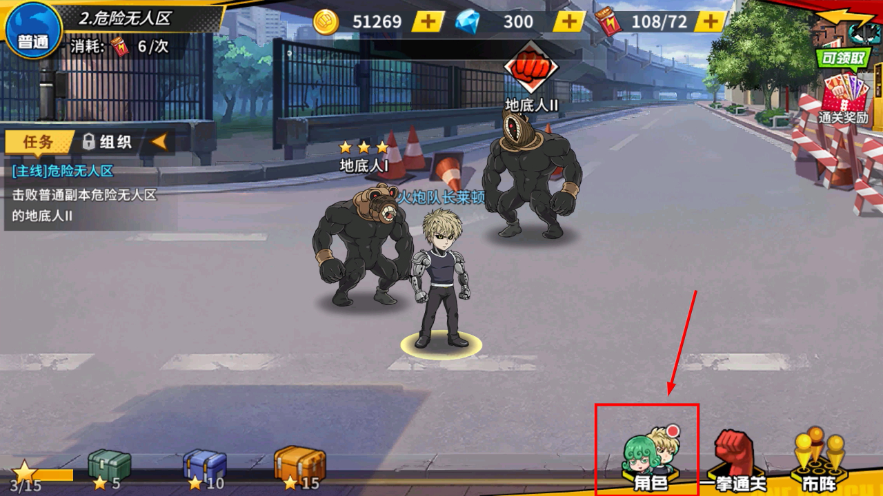 1、进入主线【危险无人区】副本,消耗【6】体力击败【地底人II】,可点击界面下方【角色】按钮查看阵容。