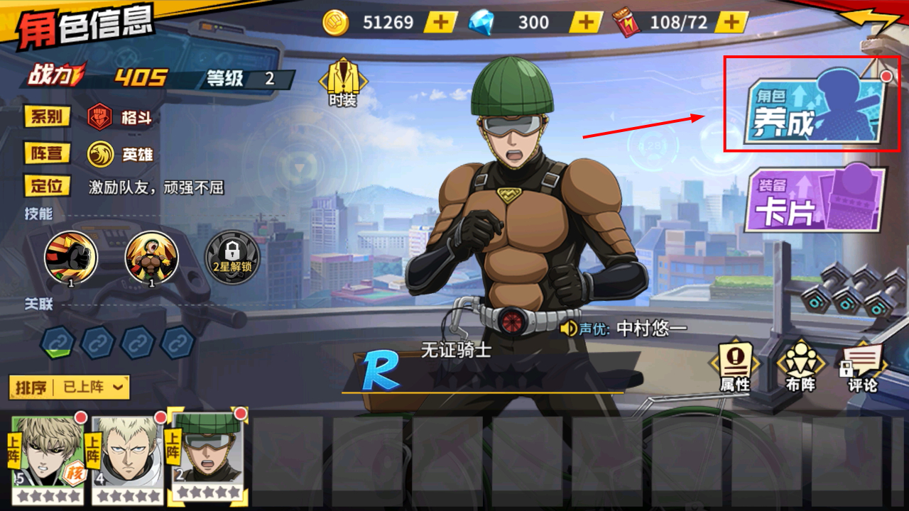 2、在角色信息页点击【角色养成】按钮,查看【无证骑士】的战力技能及定位,为后续战斗做准备。