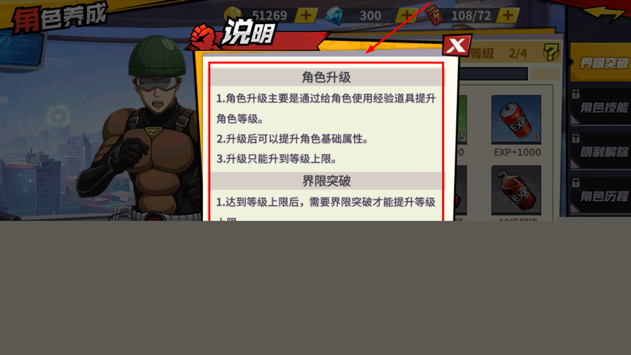 3、角色升级需用经验道具提升等级,升级增加基础属性,等级到上限后需界限突破解锁更高等级。