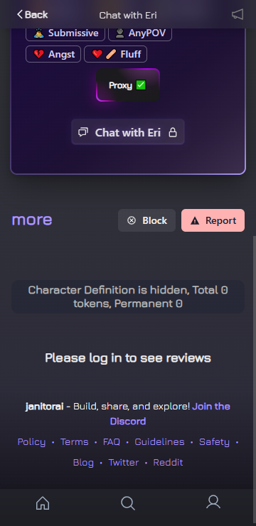 Janitor app主打一个自由且轻松使用,没有花里胡哨的页面设计和特效,只有最真诚且温暖的问候和陪伴,并且软件内汇聚了各式各样的原创Ai角色,绝对有一款会成为你的心头爱,让你灭每个夜晚流连忘返,沉浸式感受其带给你的超知心且及时的陪伴。