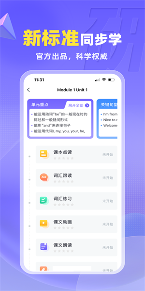 1. 教材同步学:紧密贴合外研社教材,提供课文点读、词汇学习、语法解析等功能,帮助学生巩固课堂所学。