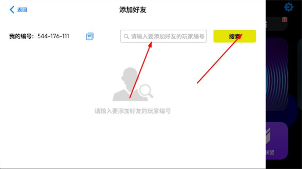 3、在添加好友界面的输入框中,填写要添加的玩家编号,点击搜索后完成好友添加操作。