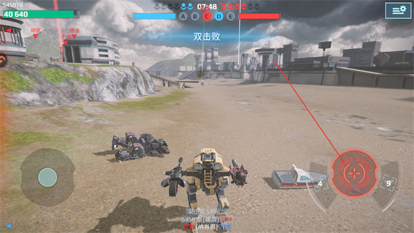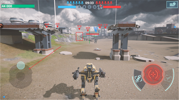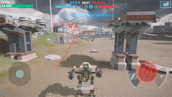 1、操控机甲移动,瞄准远处敌方目标,准备发起攻击,推进战斗进程。