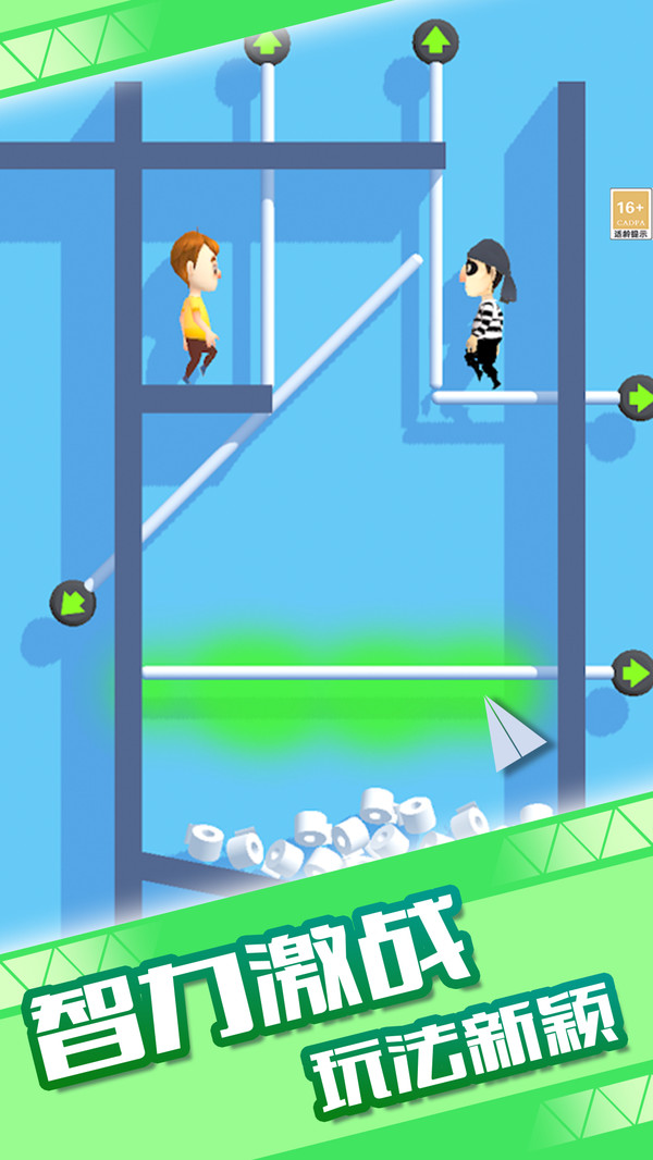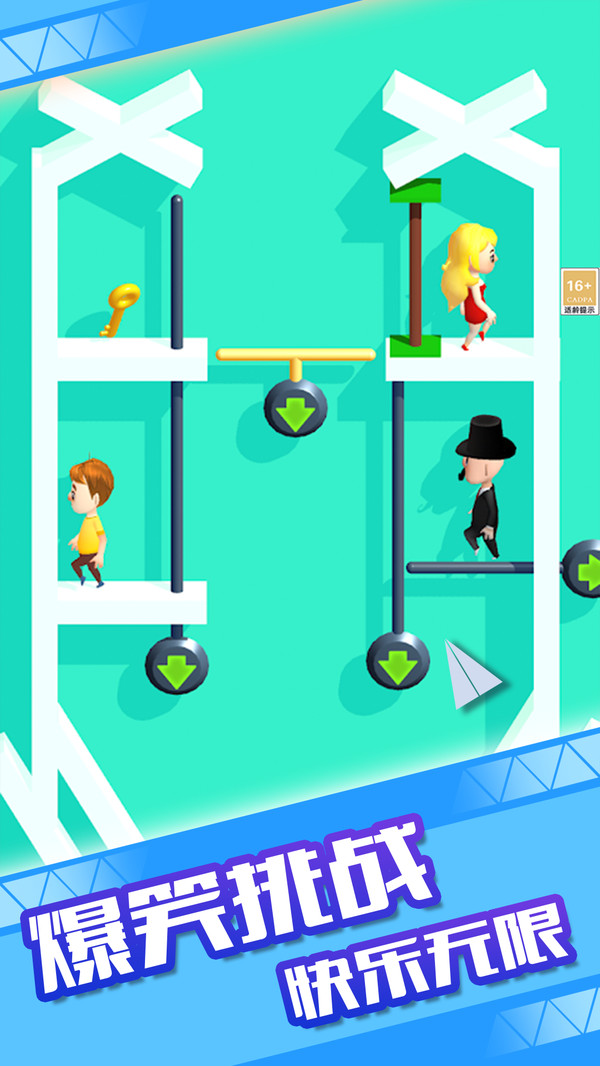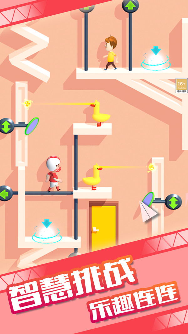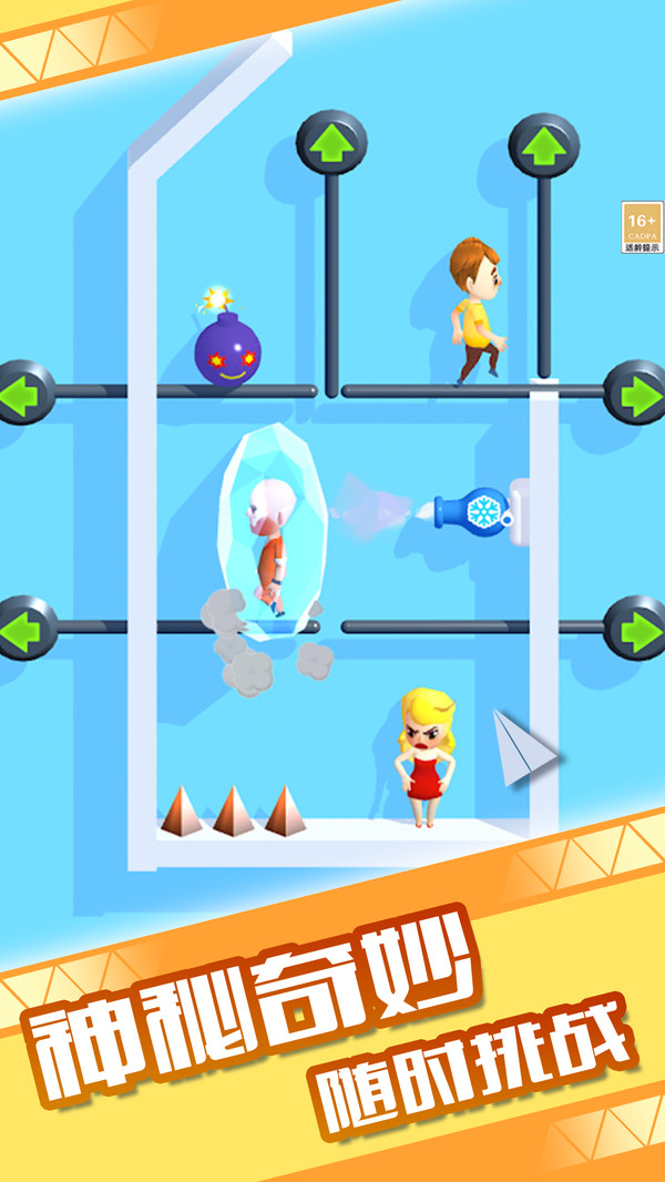 1.拖动中间机关按钮向上滑动,可开启通路帮助两位角色顺利碰面完成过关。