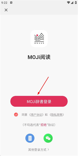 3、在登录界面勾选协议后,点击MOJi辞書登录按钮,使用MOJi辞書账号完成登录。