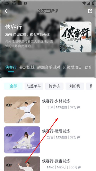 1、打开merit超燃脂app首页,在独家王牌课区域选择目标课程,点击进入课程列表页面。