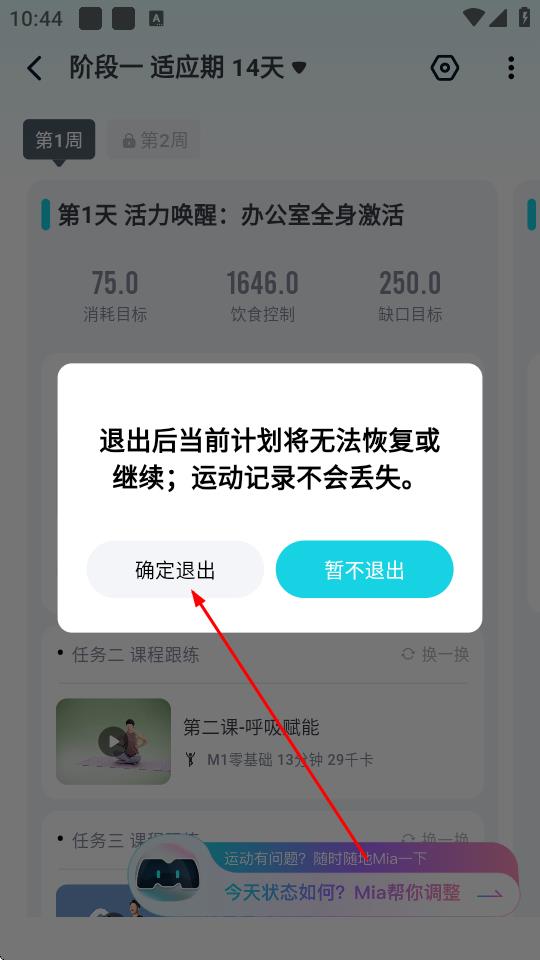4、在确认退出的弹窗中,点击确定退出,即可删除当前的运动计划。