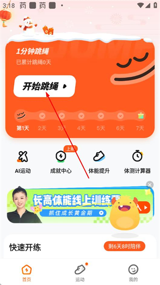 1、打开百分运动APP首页,点击开始跳绳,进入跳绳设置页面。
