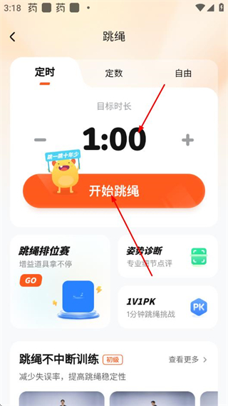 2、在跳绳设置页面选择模式、调整目标时长后,点击开始跳绳。