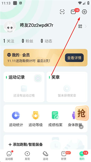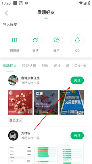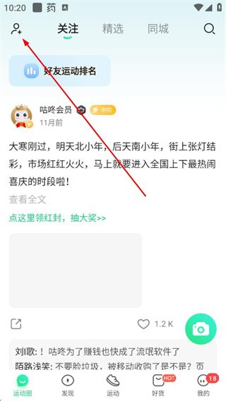 2、在运动圈页面的左上角,点击加号样式的按钮,进入发现好友页面。