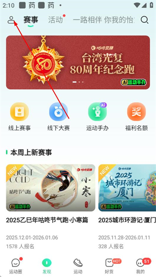 2、在发现页面点击左上角的个人图标,进入我的赛事页面。