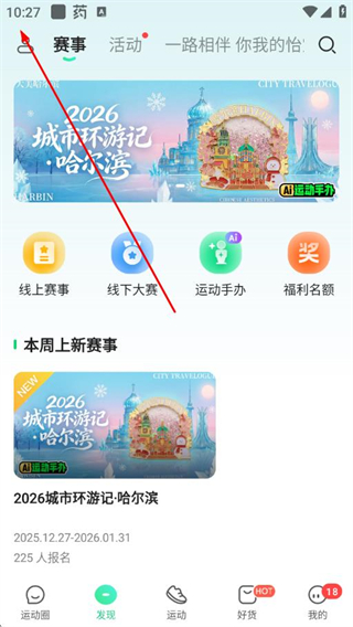 2、在发现页面的左上角,点击对应的图标,进入我的赛事页面。