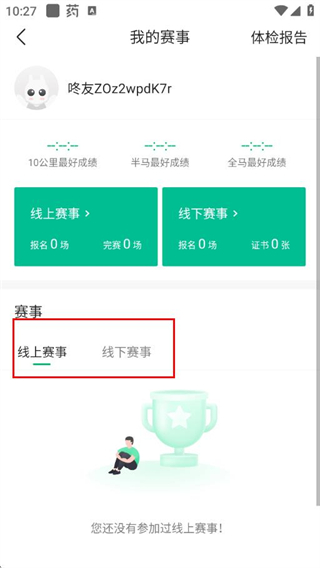 3、在我的赛事页面中,通过线上赛事、线下赛事标签,即可查看对应的赛事记录。