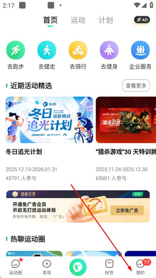 1、打开咕咚APP,在首页点击底部导航栏的我的选项。