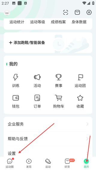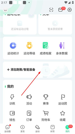 2、进入“我的”页面后,点击添加跑鞋/智能装备选项。