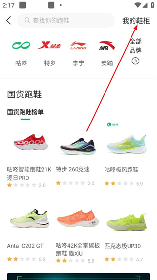 4、在跑鞋页面,点击右上角的我的鞋柜选项。