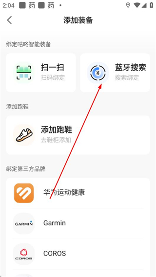 3、在添加装备页面选择蓝牙搜索,进入蓝牙搜索绑定页面。