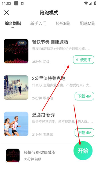 3、选择适合的陪跑课程,点击开始即可开启陪跑模式。