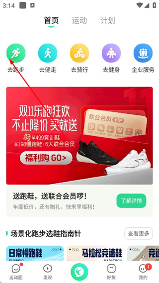 1、打开咕咚APP,在首页点击去跑步选项。