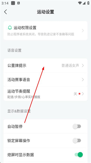 3、在运动设置页面,点击公里牌提示,进入公里牌提示设置页面。