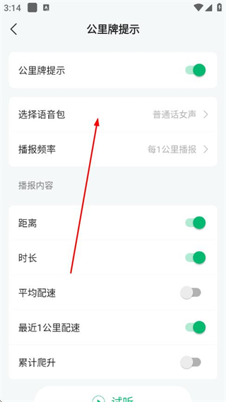 4、在公里牌提示设置页面,点击选择语音包,进入语音包选择页面。