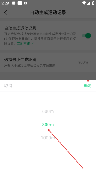 3、在自动生成运动记录页面开启开关选择最小生成距离后点击确定后续达到设定距离后app就会自动记录跑步公里数。