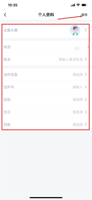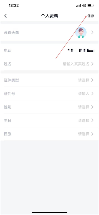 5、填写姓名、证件类型等信息后,点击右上角的保存按钮,完成个人资料编辑。