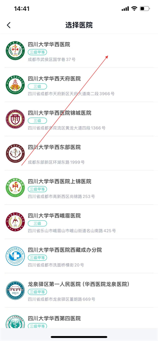 3、在选择医院页面,点击目标医院,进入对应医院的挂号记录页面。