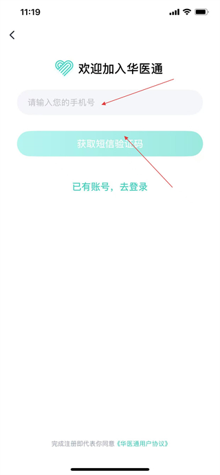 3、在注册页面输入手机号,点击获取短信验证码并填入。
