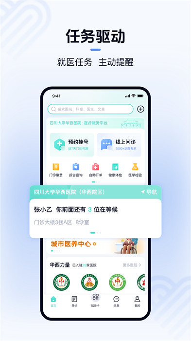 华西医院挂号app(华医通)是一款集诊前咨询、诊中就医、诊间支付等功能为一体的移动客户端,通过医患实时交互实现便捷、高效的全流程就医服务。主要为患者用户提供症状自查、预约挂号、就诊提醒、候诊查询、门诊缴费、导航导诊等功能。