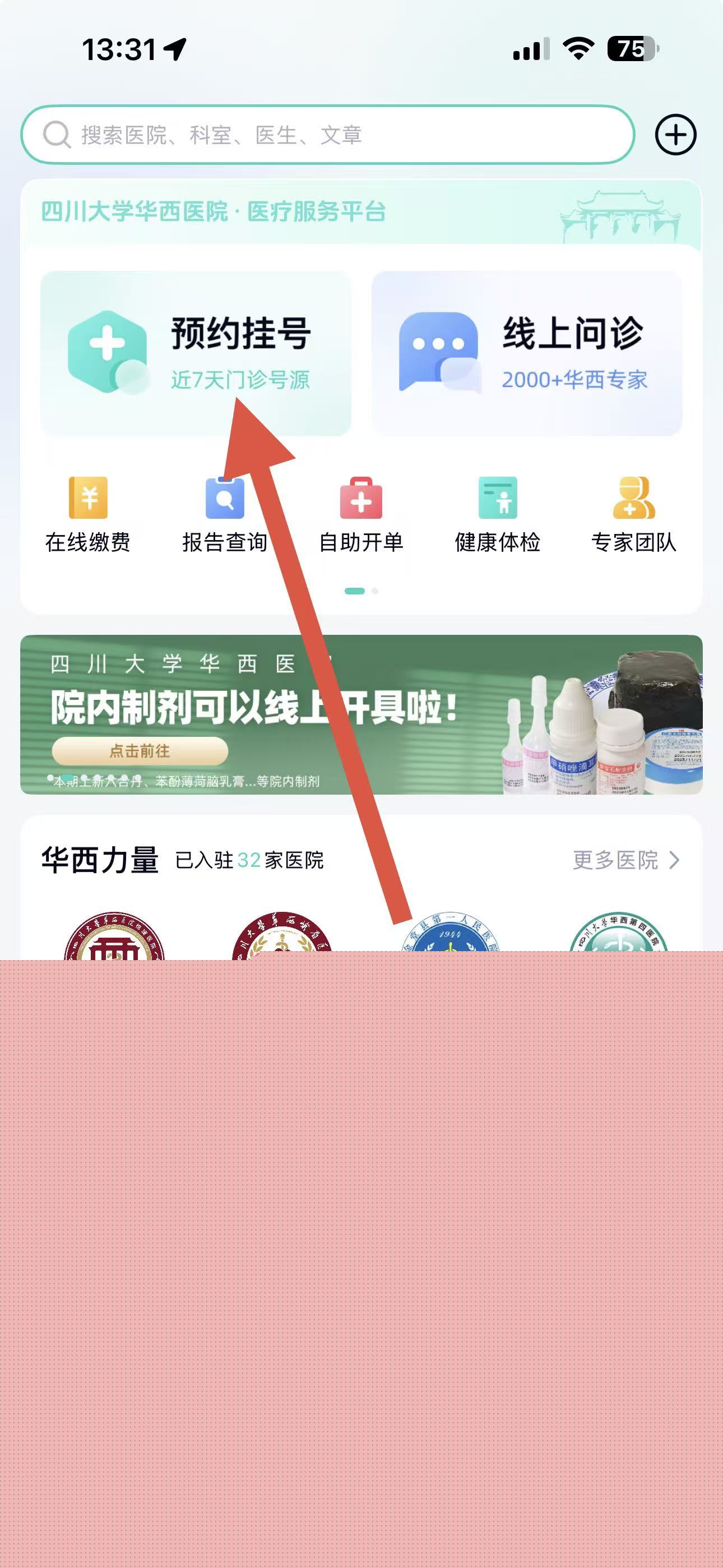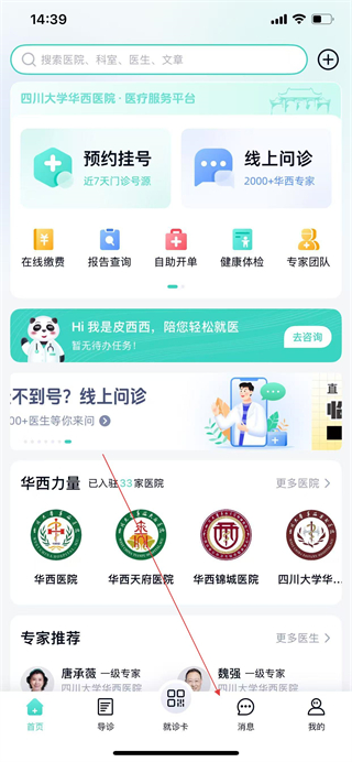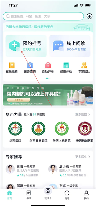 1、打开华西通APP,在首页点击预约挂号选项。