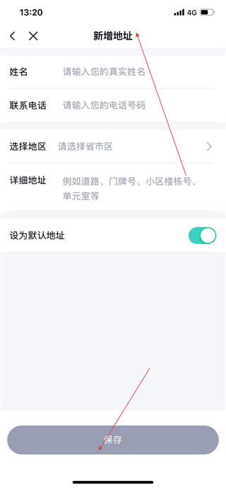 4、填写姓名、电话、地区、详细地址等信息后,点击保存,完成地址添加。