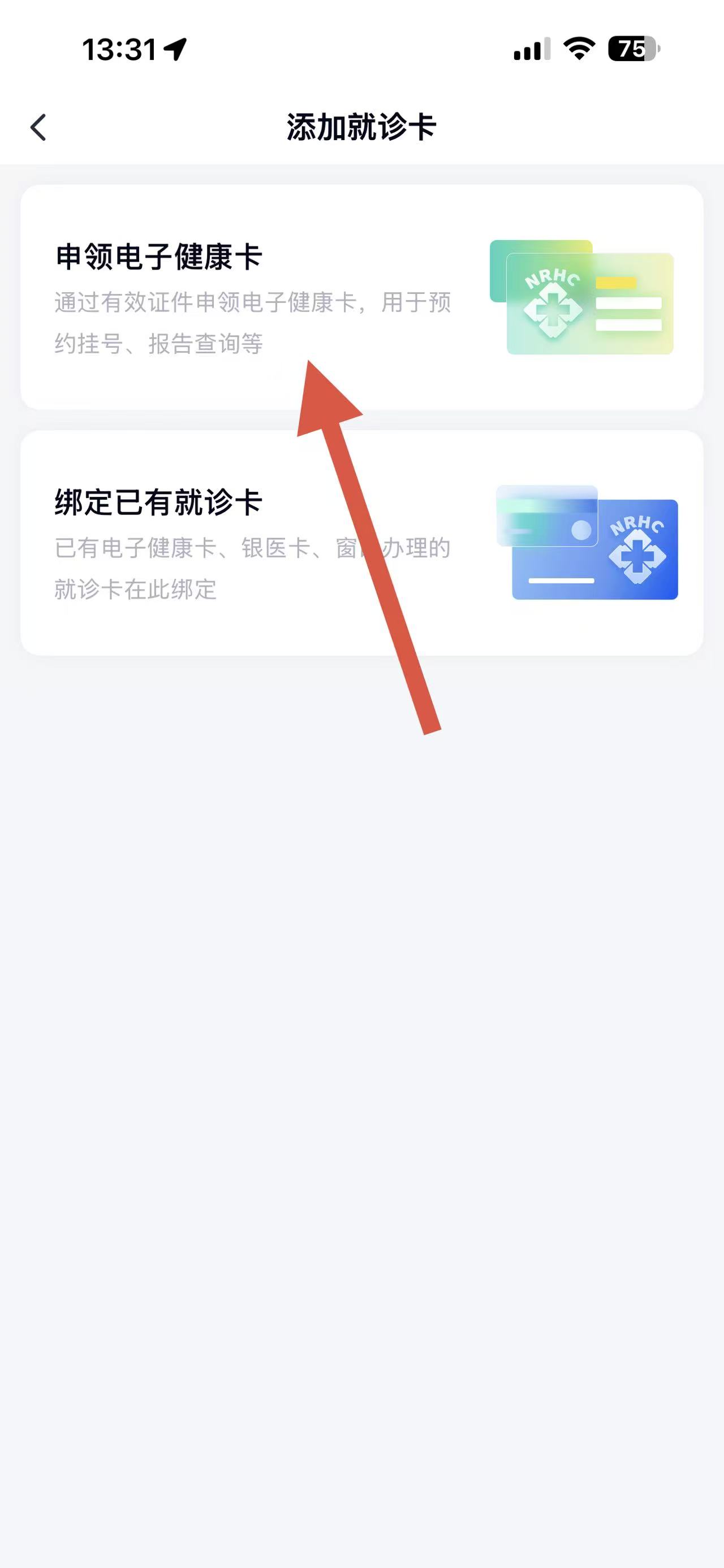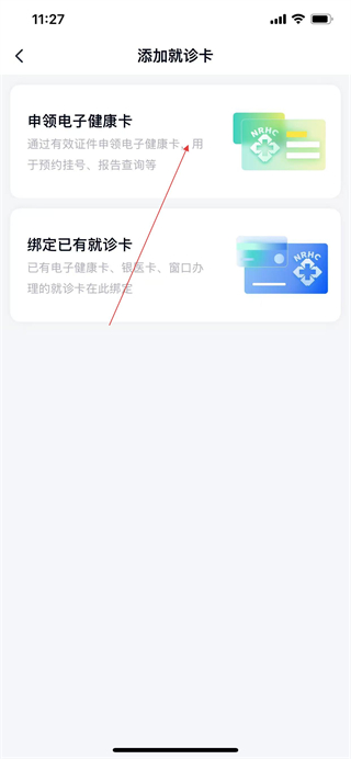 3、在添加就诊卡页面,选择申领电子健康卡选项,准备获取健康卡。