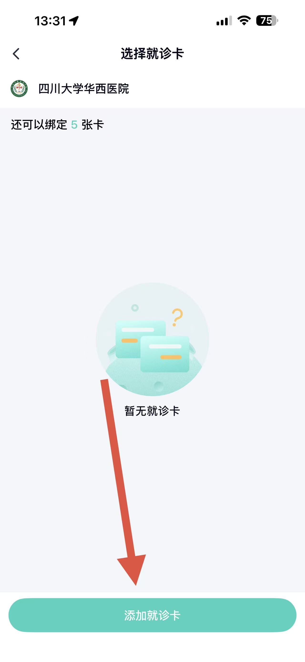 2、若没有就诊卡,在选择就诊卡页面点击添加就诊卡进行添加。