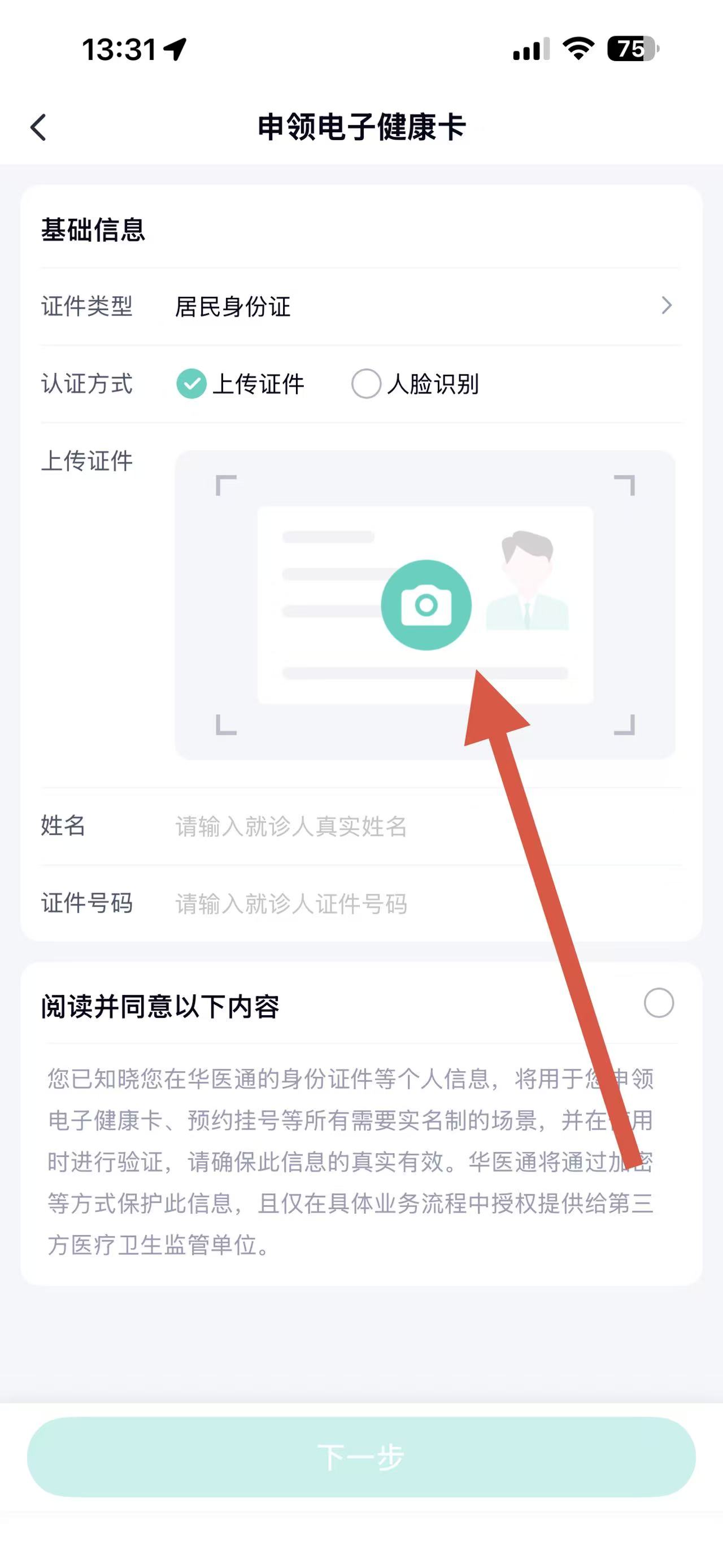 4、填写基础信息,勾选后,点击下一步,完成就诊卡信息添加。
